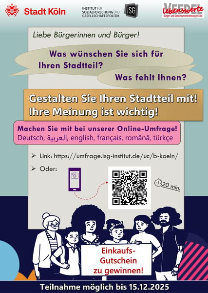 Derzeit führt das ISG Institut für die Stadt Köln das Förderprogramm „Bürger*innenbeteiligung und -aktivierung 2025“ im Rahmen des Programms „Lebenswerte Veedel” durch. Damit wird das Ziel verfolgt, Erkenntnisse hinsichtlich der Lebensbedingungen sowie Chancen und Barrieren einer gleichberechtigten gesellschaftlichen Teilhabe von Bürger*innen in unserem Sozialraumgebiet zu gewinnen.